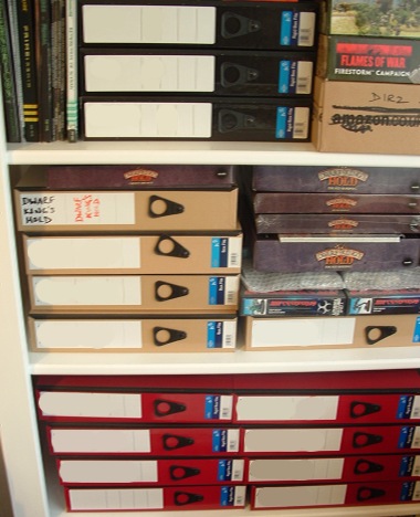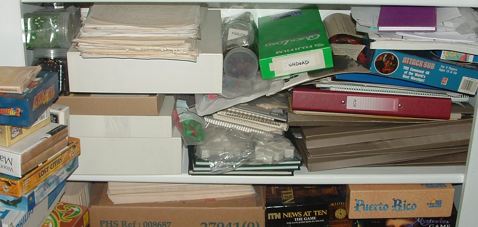 And this is one of those shelves. This is an unsorted one (as you may have guessed). Attack Sub is really that game (not sure why it’s here), as are the ones in the pile on the left, but the other boxes are just boxes and have various prototypes of different games I have designed in. I have some blank rigid boxes as you can see, but they’re very expensive to buy. Much cheaper to buy a cheap game or jigsaw from the local charity shop and chuck away the contents. Before anyone comments on Puerto Rico, that’s a copy I found cheap in a game shop ‘cos someone had pinched some of the bits. For me it was just a cheap source of pieces and a nice box. Needless to say, I have a proper copy elsewhere 🙂