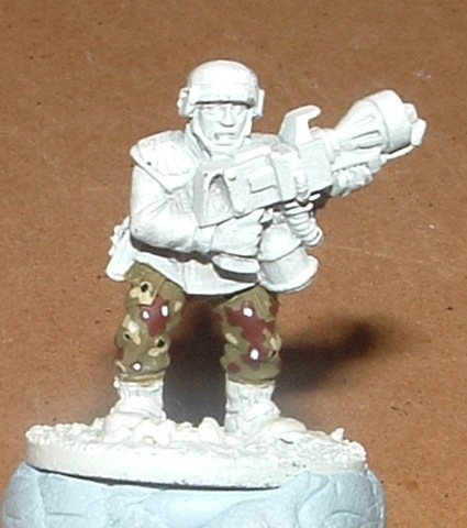 The Imperial guardsman got some base colours on his camo trousers. I like painting camo, and this was made up as I went along after a bit of a thought about a colour mix. It will get shaded/highlighted/tinted from these base colours. Some camouflage patterns are so intricate that highlighting and shading them just looks messy and obscures the pattern, but this is relatively simple so it should be OK. There’s only one way to find out.