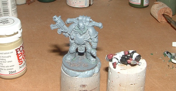 The powder monkey got hacked off his old base and the Plague Marine got a spray of grey primer so they’re a little closer to having colours on them.