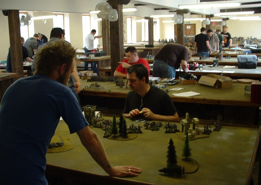It’s been a hectic day at the front, with 3 games played and much happy banter, cursing of luck and other associated gaming nonsense. I’m a bit brain fried to write much sensible for the moment, so I’ll mostly be posting photos today and will comment more after the thing’s over tomorrow. To kick off, the obligatory room full of gamers pushing toys about: