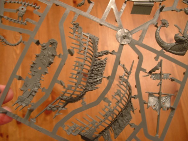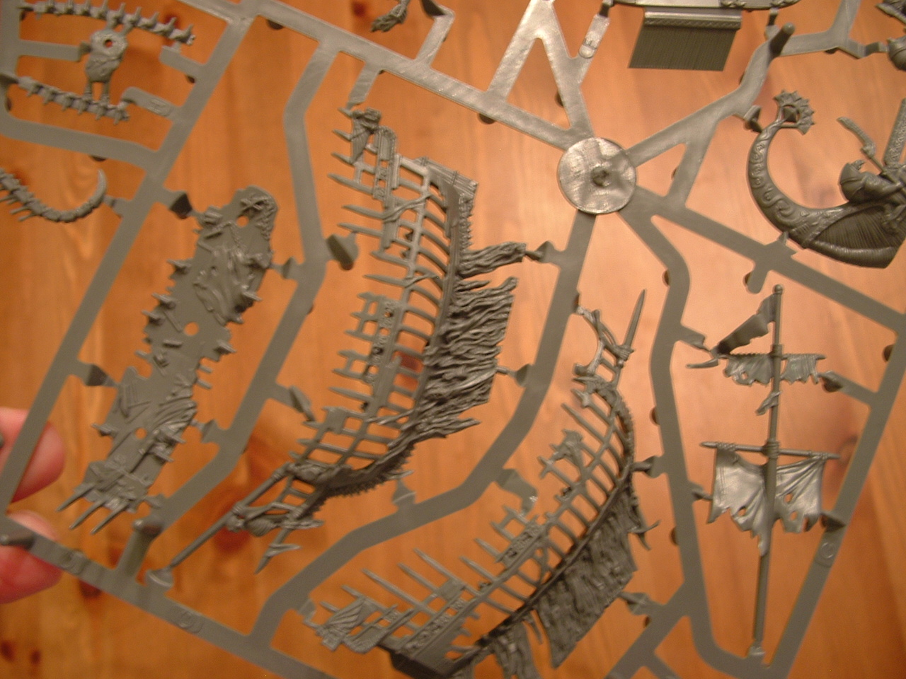I seem to have acquired a copy of Dreadfleet, and thought you might like to see some photos of the sprues close up. There’s already a bunch of pictures on GW’s own site showing the whole sprues, so I’ll try not to repeat all that. Photos are intentionally left larger than usual because the detail is the point. More commentary when I’m less asleep 🙂