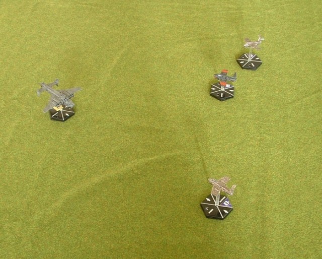 We ended up playing this 5 times as it was nice and fast, but still left a few tactical options to consider. Honours were fairly even, but Bob had the upper hand in the end. The first pics show me closing in on Bob’s Marauder in the first game, firing one shot as I passed and then attempting to close up form behind. The second shot is me turning to pursue and the third is Bob being wriggly. Boy, he’s an erratic flyer. It’s a long way to get down the whole board (the Marauder has a max speed of 3 in this scenario), but he managed to escape with a single wound left.