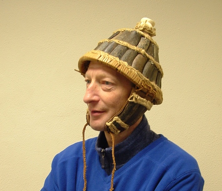 It’s been a fun day, not least because I had a game of Tribes of Legend with Nigel Stillman (and then a bunch of us played Condottiere). For those of you that are not familiar with Nigel, he worked for GW for years, but his gaming credentials go back further by far, to authoring classic WRG publications that every Ancients gamer should know. He is, by inclination and trade, an archaeologist that specialises in the early Bronze Age in the Middle East. He’s also a very entertaining chap. He does, for example, turn up to open days with some of his latest experimental archaology in the form of a horn helmet. Not a horned helmet, mind you, one made from (buffalo) horn, much like the boar tusk helmets you see. Anyway, here’s a photo of him wearing it. A very sturdy piece of kit it is too.