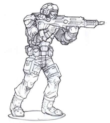 Well, I just got back from Mantic Central and have managed to get my paws on some of the first of the Corporation figures for Warpath. Now I only got them on the specific understanding that I wouldn’t be showing them to you guys yet (‘cos Ronnie knows I like to share these things), but have a look at this concept art.