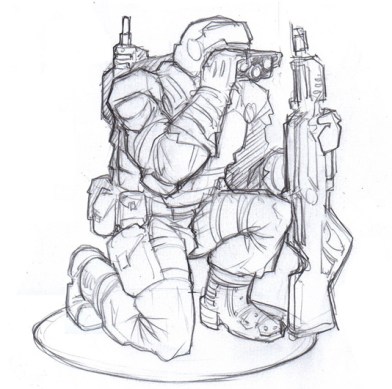 The models are fairly faithful renditions of this art. Obviously there are some detail differences of pouches, grenades and other bits of kit between models, but this is the basic armour they’re in and equipment they’re carrying. Very nicely rendered it is too. The anatomy is more realistically proportioned than GW figures, which is good or bad depending on your personal preference. I rather like it, myself, even though I’ve been looking at GW figures for so many years that they don’t really look as strange as they are – at least, not until you look at any humans 😉