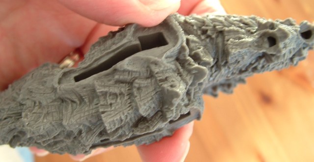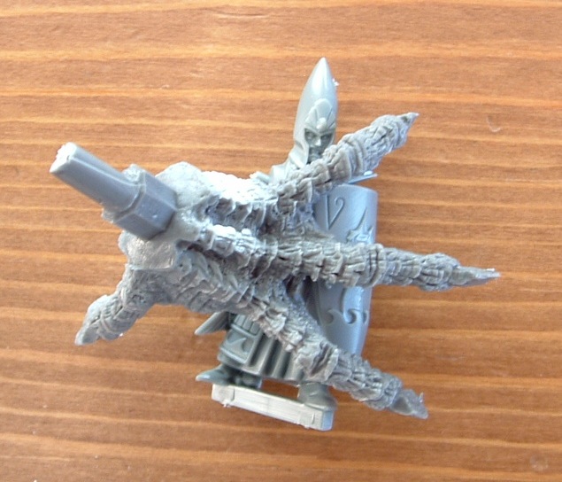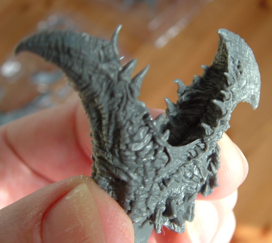 What else can I say? Oh, bubbles. With all the comments we get about Finecast and so on being full of bubbles, I had a really close look at this. At first I spotted that lots of the spikes that come in the little bag (on the left of the photo above) and go onto his back have bubbles. Then I looked closer. Actually I think it’s detail, and not bubbles at all. To start with, they’re the only thing with these holes in, and they form in little rows of 2 or 3. I eventually decided that it’s another type of texture that’s just slightly different from the horn or claw (which don’t have this pitting). I carried on looking, and eventually found one thing that I could convince myself might really be a bubble on the casting block of the head. So even if it is a bubble, it’s irrelevant. Chalk up another plus for Legacy Miniature’s casters.