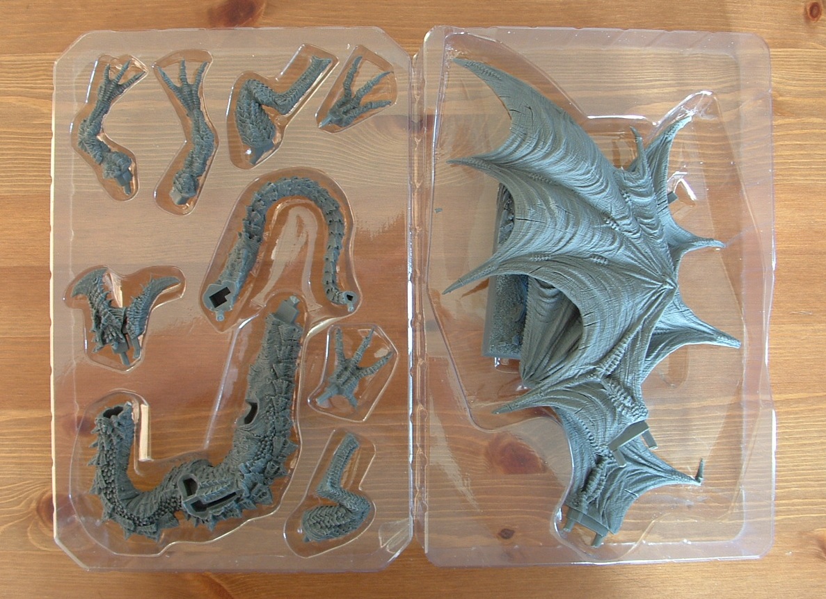 The contents break down into two trays of bits. The first has the head, body and limbs in several pieces. The second has the wings, the base and two little packets of spiky bits, claws and the odd thumb.