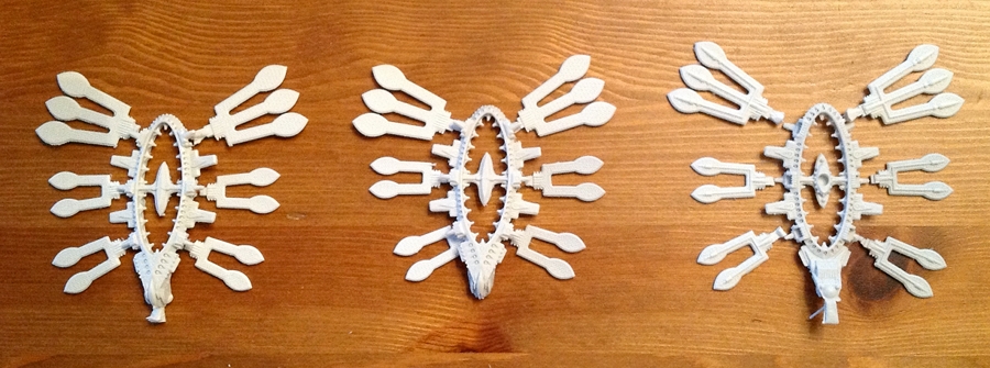 Now we start getting to the increasingly odd looking models. Especially when they’re in bits. These are Haven terragates. The Shaltari have a fondness for teleporting about the place, and this is one of their smaller efforts. The set on the right is inverted. As you can see, no part is too obscure or well concealed to escape the detail that romps over every surface.
