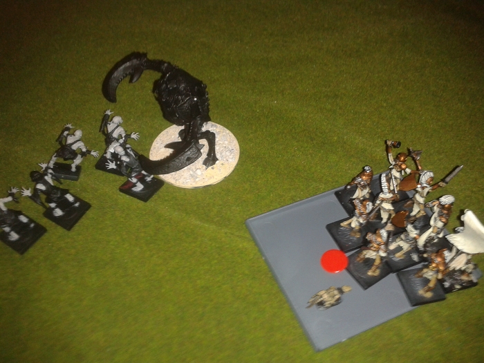 Lining up on the opposite side of the table was a small, but fearsome-looking force consisting of a unit each of T’lekkan Warriors, Black Warriors, and Princelings. There was no chaff in this army as all three are elite units in their own way; the Warriors in melee, the Black Warriors with their vicious Spit Acid ranged attack, and the mobile and surprisingly durable Princelings with their 14” movement, oh, and they can fly. If that wasn’t worrying enough they were backed up by the mighty Behemoth, a close-combat wrecking machine which at 24 points is the second most expensive model in the game, and in a 24 point game such as this it is the most expensive model that could be fielded.