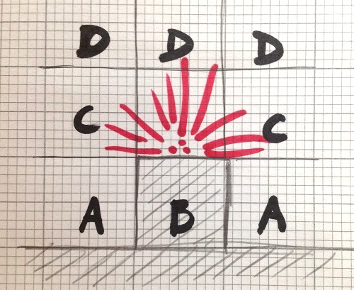 This diagram is a side-on view of a grenade exploding on top of a single level block (B). Yes, it’s not a pretty sight, but them’s the dangers of dealing with Alphas 😉