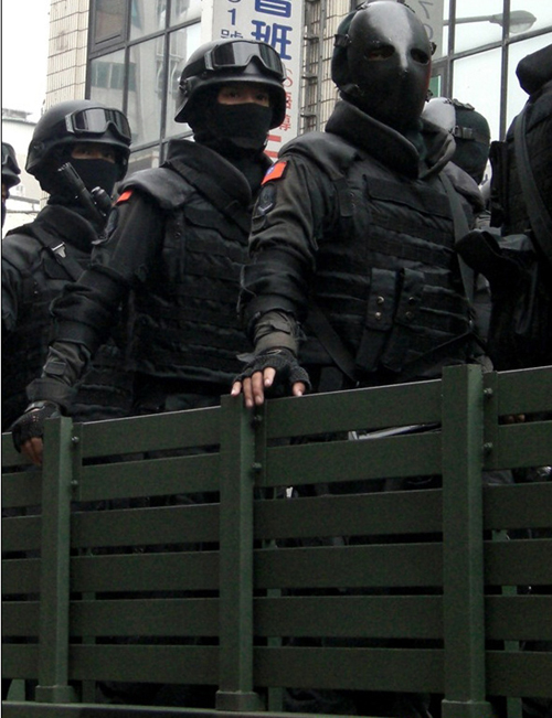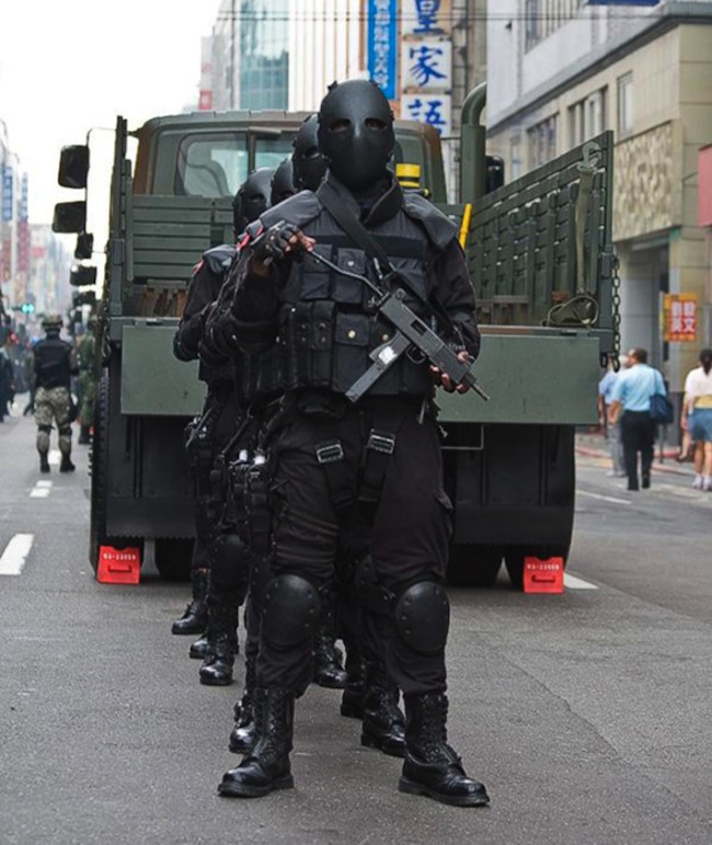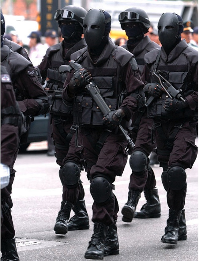 These guys aren’t police, or even SWAT. Their unit badges make it clear they are soldiers, and their equipment is special forces CQB for anti-terror operations.
