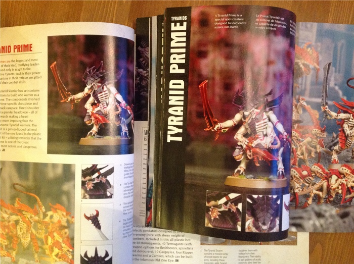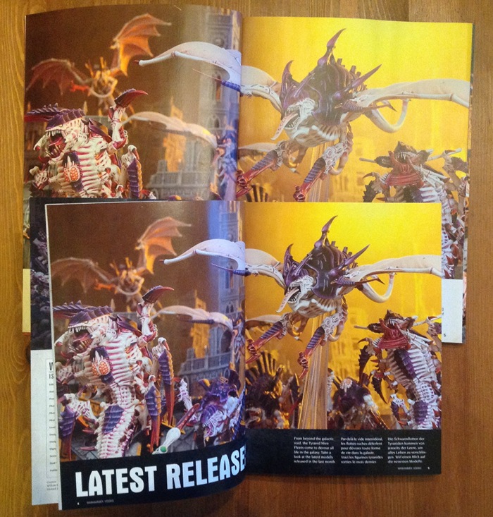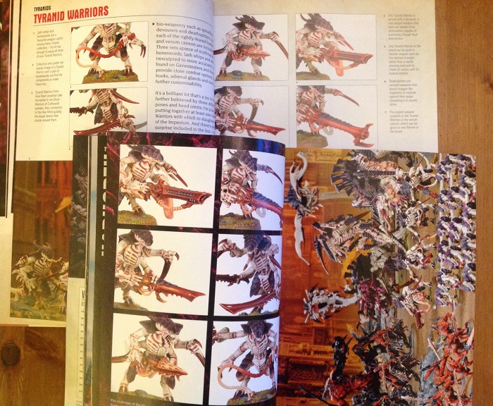 There is a Paint Spatter article that shows the different colours of the various Tyranid hive swarms. No discussion, no tips, just a list of colours to use and a picture of a bit of the model with it on.