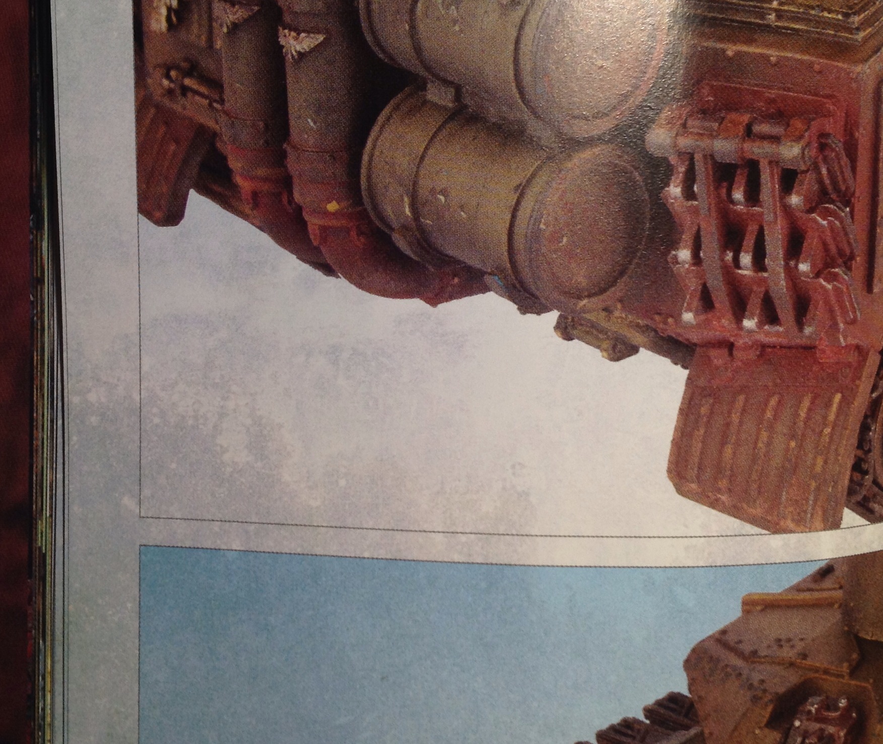 A showcase of Golden Demon entries from the Memphis incarnation of the competition promised to be more worthwhile. There are, indeed, a few very nice pieces here. Unfortunately they are rather spoiled by the overdone page design. Really nice models don’t need fancy backgrounds to show them off, and in this case the textured and splattered backgrounds made deciphering the equally textured and spattered tanks, etc more difficult. When the whole page is a distressed texture then the actual model you’re supposed to be looking at gets a bit lost. These two pics below have been left large so you can see what I mean. The page texture encroaches past the black keyline round the edge of the photo. Does it go over the model itself and confuse what you’re looking at? I don’t know. Am I looking at clever painting techniques or some paint/layout hybrid? I don’t know.