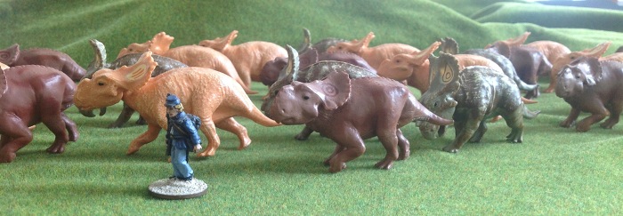 There are a number of metal ranges of dinosaurs, and some lovely models among them. My issue with them is really only one of price. Ones and twos of high end predators is fine, a few of this or that of the smaller dinos for colour is great too. But all the most memorable of the imagined prehistoric vistas I’ve seen since childhood have been dominated by herds of the big herbivores, and though pachyrhinosaurs aren’t enormous they look grand en masse and really set the scene. Now, having saved on this broad canvas, I can root through the metal ranges for some additional details. Who knows, I may find something at the show on sunday. Does anyone have any suggestions?