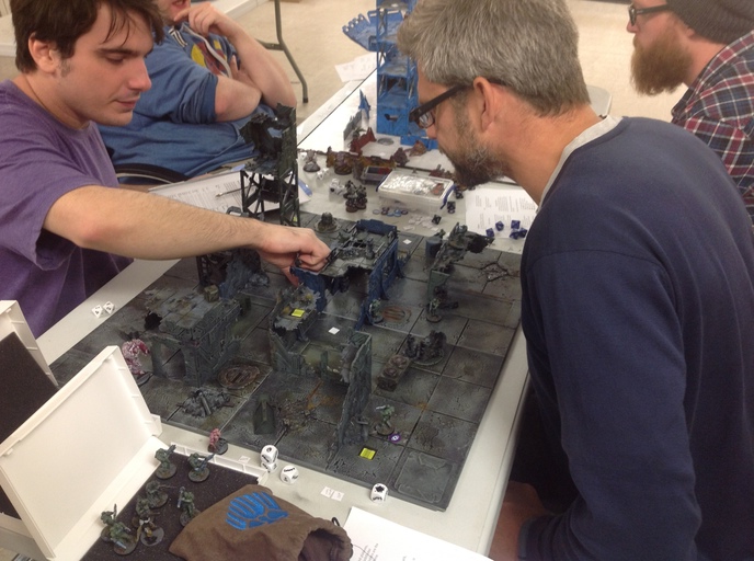 In the foreground they’re playing on Ronnie’s scenery – a Secret Weapon board with Mantic’s battle zone buildings and some Antenociti scatter terrain. I think RR’s done a nice job with it.