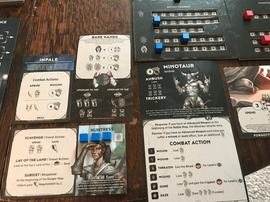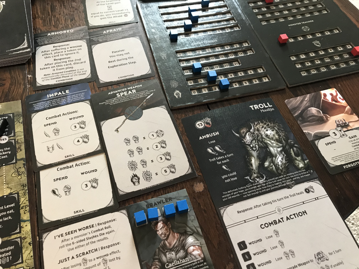 I’ve checked the rules and I’m pretty sure I was playing as intended. However, it all went deceptively smoothly. I quickly crafted myself new weapon after new weapon and ended up fighting all four monsters successfully. As a measure of how well I was doing, I beat the final level four troll without taking a single wound.